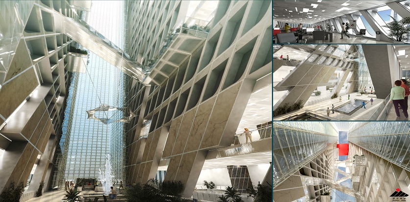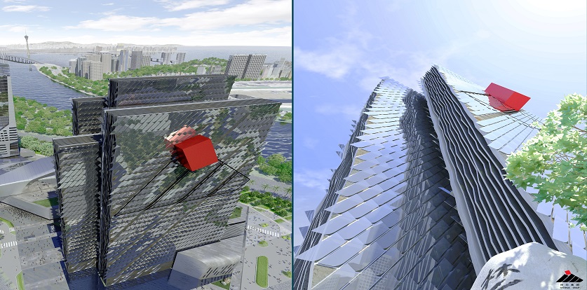 設計手法:配合該區域經濟發展情況,在短期內還需要建設高質量的建筑物。成為城市性標志建筑。新總部形象需與自然融為一體,并與周圍的自然元素銜接,且在某種情況下可形成一面“鏡子”,通過一種特殊形式反射出這些形象:反射出天空的藍,反射出公園的綠、反射出海水的藍。設計了波浪狀的垂直立面,是考慮波動的立面可反射出更加逼真的形象。同時對總部辦公樓進行體量調整:整體形象為四個垂直棱柱,分別象征著神華集團里四所不同行業的公司。此設計理念主要基于神華集團的組織結構分布,外立面上醒目的集團標識也再次闡述了建筑的寓意。紅色的棱形柱,橫架于四個建筑物中,象征著燃燒的煤炭。該設計手法加強了對標志概念性的解讀。對于酒店,設計過程中不引入象征性元素。是基于其本身別具匠心的形象,該形象符合商業廣告的標準,設計過程引入了宏觀穿孔材料,以打造高水準客房。特殊的宏觀穿孔材料可“適應”窗口角度,不斷調整以指向天空,產生出兩種不同形象的效果,一種是為順應商業的標準,而另外一種則體現出其自然屬性。兩座塔樓,一座是總部辦公和及其基礎設施用房,另外一座是酒店,位于同一群樓的二者功能分布其中,視覺上又形成整體效果,打造出一個綜合體。會議中心設置在群樓上方,該設計理念則是源于一種自然設計的手法??偛康乃呛途频昃鶠槟媳背?,并合理地運用錯層式設計,使其坐看珠江和澳門海灣美景。