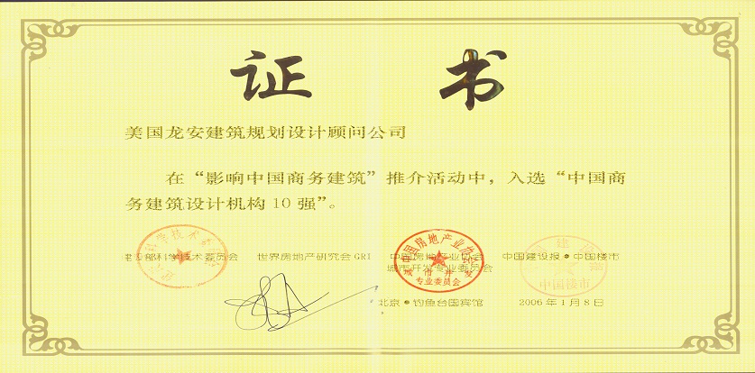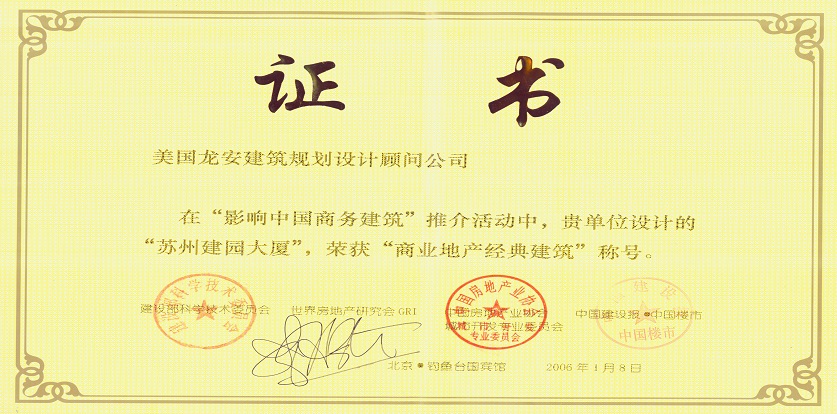 獲獎情況:2006年,中國建設(shè)報中國樓市主辦“影響中國商務(wù)建筑”推介活動,榮獲“商業(yè)地產(chǎn)經(jīng)典建筑”稱號;美國龍安公司榮獲“中國商務(wù)建筑設(shè)計機構(gòu)10強”,饒及人先生榮獲影響中國十大公建設(shè)計師稱號。
