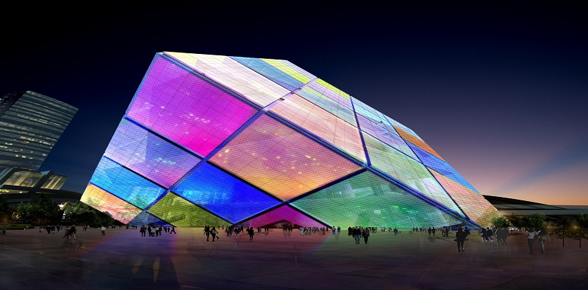 為了使魔方體在夜晚產(chǎn)生奇幻的視覺效果,演藝廳橢圓穹頂及魔方體玻璃外殼上設(shè)計了一套完整的LED夜景照明系統(tǒng)。