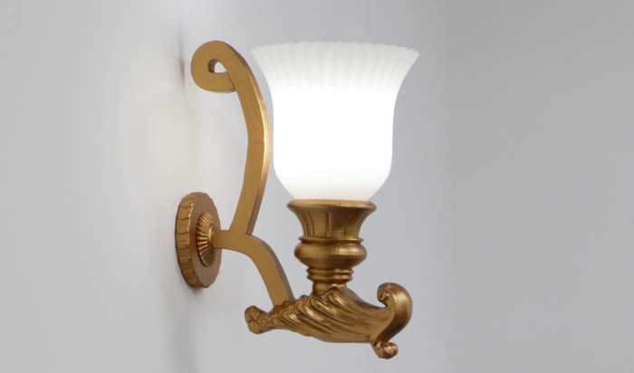 這款歐式壁燈燈壁厚度約1.5mm,采用了透明的PLA 3D打印材料一次性打印成品,燈罩處可以配置不同顏色的LED燈芯,在保證美觀的前提下,照明效果能達(dá)到足夠的亮度。