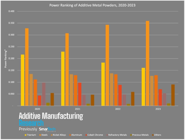在評(píng)估金屬粉末市場(chǎng)時(shí),平衡增長(zhǎng)和銷量等因素非常重要。為了正確比較金屬材料對(duì)整個(gè)3D打印市場(chǎng)的重要性,AMR制定了一套實(shí)力排名的方式,最終將數(shù)據(jù)標(biāo)準(zhǔn)化以進(jìn)行跨年比較。從 AMR 最新的實(shí)力排名圖表中,我們可以發(fā)現(xiàn):