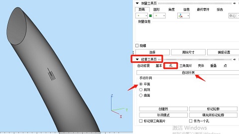 ④使用“修復(fù)工具頁”,選擇“孔”,選擇“平面”,對分割后的2個(gè)模型都進(jìn)行自動(dòng)補(bǔ)洞,也可以根據(jù)實(shí)際孔洞的起伏形狀來選擇“曲面”或“規(guī)則”來補(bǔ)洞。