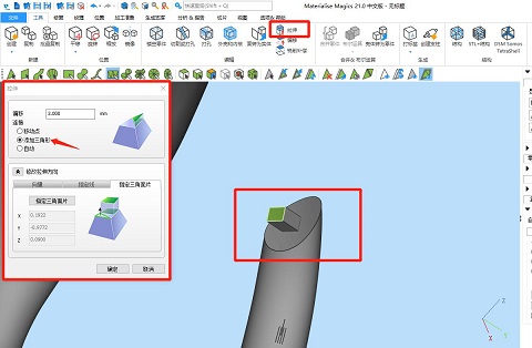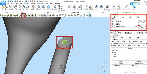 ⑤設(shè)計(jì)插銷,選擇“框選標(biāo)記并重畫網(wǎng)格”功能,選擇一個(gè)模型的接觸面并框選出插銷大小和形狀??梢越柚晥D工具頁來精準(zhǔn)調(diào)節(jié)視圖方向。