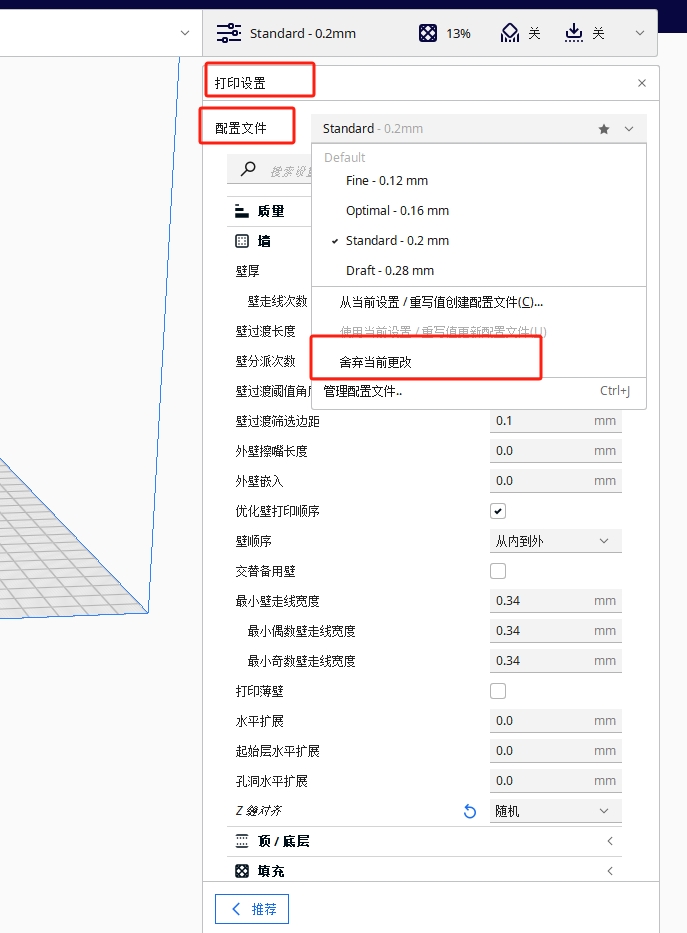 很簡單,您只需在軟件右邊“打印設(shè)置”-“配置文件”中點擊“舍棄當前更改”就可以恢復(fù)到默認設(shè)置。