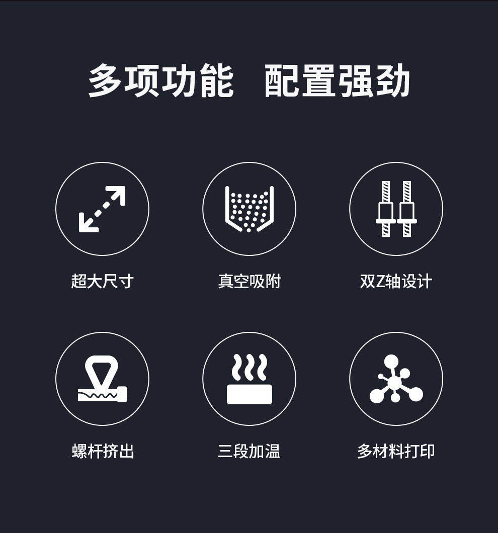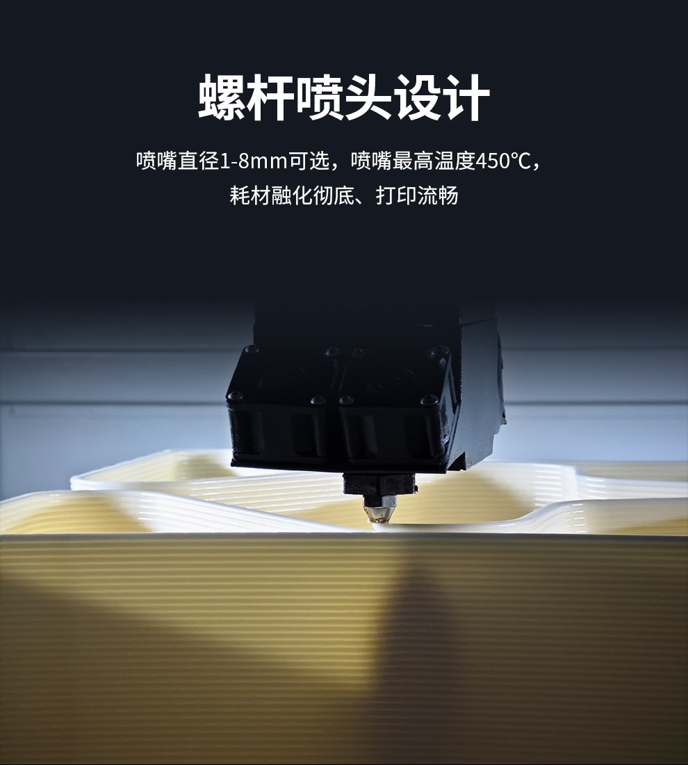 1.8米的超大打印尺寸,適配多種顆粒料耗材,具備更強(qiáng)大的塑造能力
